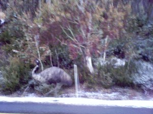 So a good day, nice to experience another mountain, although I would like to go back there when its sunny. BUT, the highlight of my day was on the drive up to Thredbo in the morning…….. I got the shock of my life when I saw these 2 Emus just chilling on the side of the road. They are like gigantic Chickens with orange eyes! I took a pic but it didn’t come out that well, but you can just about make it out